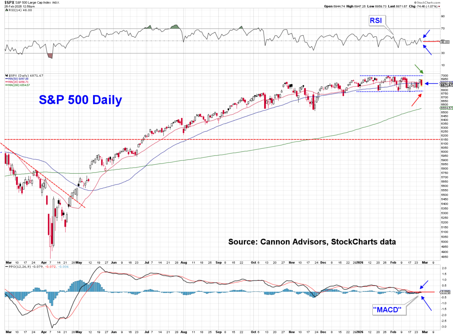 This type of market environment requires time and patience, in that it could result in either a break up (good) or break down (bad) from this zone. RSI is a key indicator we follow and is reflecting the market's indecision by oscillating above and below the 50 line without clear direction - note: we want to this trend up above 50 to feel confident. The same goes for the MACD, which is hugging the zero line. The 20-Day Moving Average has rolled over a bit, which is an early negative indicator, but not something we would act on independently; while the 50-Day moving average (more important) has seen its trajectory flatten a bit. For the time being the 20-Day is still barely above the 50-Day Moving Average, which is good, but it's real close to breaking it - which would be an early red flag, and one we are watching closely. The 200-Day Moving average remains positively sloped at this point - but is too much of a lagging indicator act on.